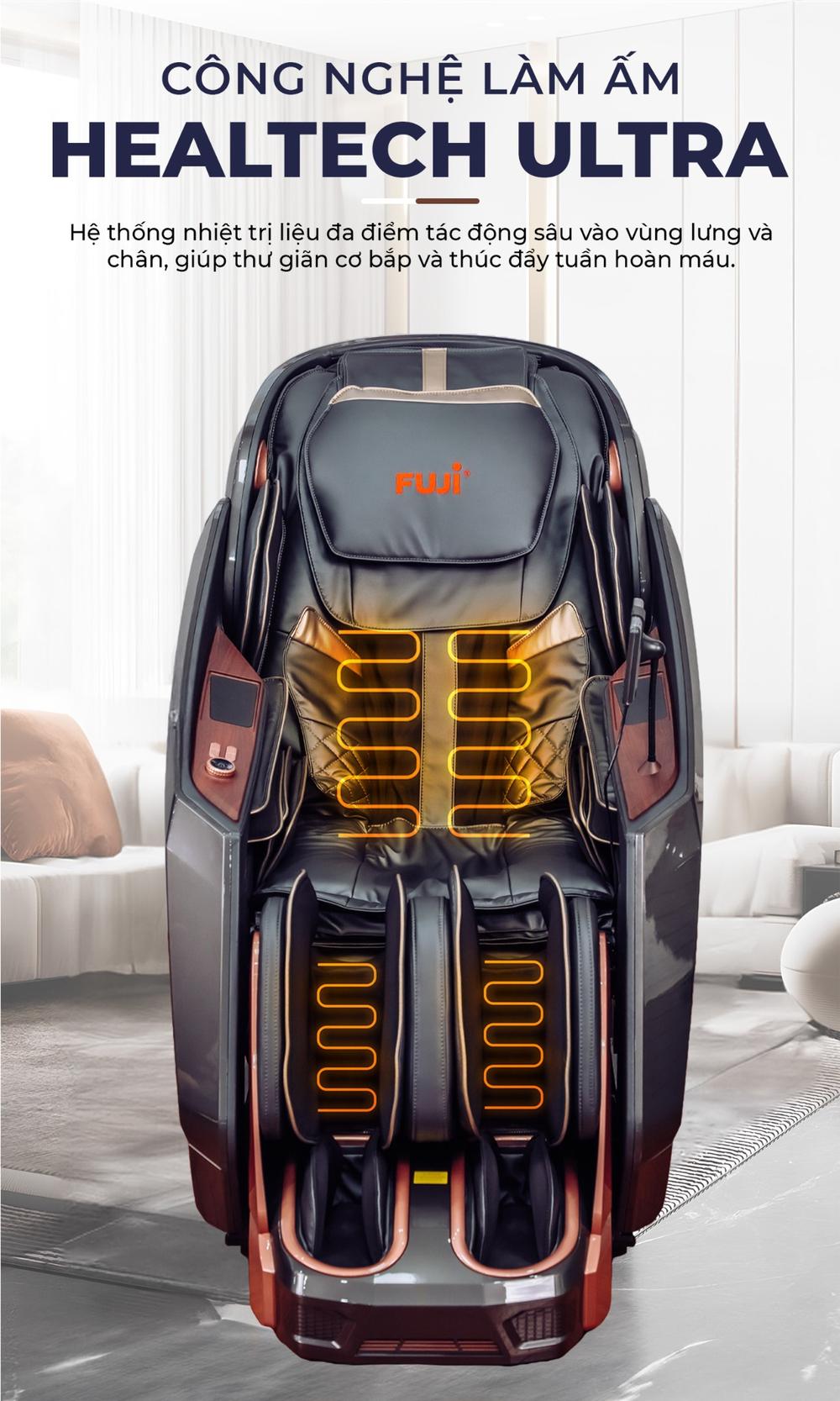 Công nghệ làm ấm Healtech của Fuji sử dụng sợi carbon để phát ra tia hồng ngoại tại các vùng massage trọng điểm như lưng, thắt lưng hay bắp chân. Khi hệ thống này được kích hoạt, nó sẽ phát ra các tia hồng ngoại có khả năng thẩm thấu sâu vào da và mô mềm, khoảng 1-3mm, mà không gây nóng rát bề mặt da như nhiệt thông thường. Khi đi sâu vào bên trong, năng lượng hồng ngoại sẽ kích thích các phân tử nước trong tế bào rung động, tạo ra nhiệt lượng nội sinh. Sự thẩm thấu nhiệt sâu này mang lại nhiều lợi ích trị liệu như, làm giãn nở các mao mạch máu và động mạch nhỏ, giúp tăng cường lưu lượng máu đến các vùng cơ bắp và cơ quan nội tạng. Cải thiện đáng kể quá trình vận chuyển oxy và dưỡng chất đến các tế bào, đồng thời đẩy nhanh việc đào thải các chất cặn bã và độc tố ra khỏi cơ thể. Đặc biệt, nhiệt hồng ngoại giúp làm mềm cơ co cứng, giảm co thắt và giải phóng áp lực lên dây thần kinh, mang lại hiệu quả vượt trội trong việc giảm đau mãn tính và đau mỏi sau vận động.