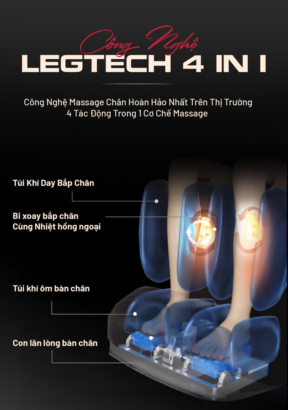 Công nghệ massage chân chuyên biệt trên ghế massage Fuji mang đến trải nghiệm chăm sóc sâu sắc và toàn diện cho đôi chân. Thay vì chỉ sử dụng túi khí thông thường, ghế massage Fuji tích hợp hệ thống con lăn hiện đại ở lòng bàn chân, thực hiện các động tác day, ấn huyệt, xoa bóp chuyên sâu. Kết hợp với hệ thống túi khí ôm trọn bắp chân, mắt cá và mu bàn chân, công nghệ này giúp thúc đẩy tuần hoàn máu, giảm sưng phù và loại bỏ mệt mỏi hiệu quả. Đặc biệt, tính năng nhiệt hồng ngoại được tích hợp ở vùng chân giúp làm ấm, giãn cơ và tăng cường hiệu quả trị liệu. Nhờ vậy, ghế massage Fuji không chỉ thư giãn toàn thân mà còn tập trung phục hồi năng lượng và sức khỏe cho đôi chân, mang lại cảm giác nhẹ nhàng, sảng khoái sau mỗi lần sử dụng.