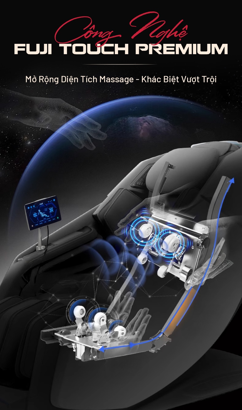 Công nghệ massage Fuji Touch Premium là một bước tiến vượt bậc, mang lại trải nghiệm mô phỏng bàn tay chuyên gia chân thực và tinh vi hơn so với các thế hệ trước. Nó không chỉ có thể chuyển động linh hoạt trong không gian 3 chiều, mà còn bao hàm khả năng điều chỉnh thông minh về cường độ, nhịp điệu và độ ôm của các thao tác massage, đảm bảo từng động tác như xoa bóp, đấm, vỗ, day, miết, nhào nặn được thực hiện với lực vừa đủ, tác động đúng vào các điểm căng cứng hay huyệt đạo cần thiết.